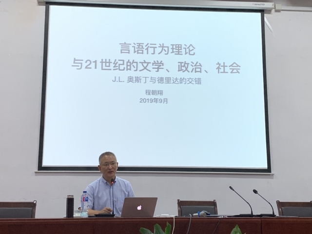 程教授从20世纪下半叶的语言学转向说起,向师生们介绍了奥斯丁及德里达在言语行为(speech acts)理论上的交错。程教授简要回顾了奥斯丁的言语行为理论,并介绍了德里达对该理论的修正,以及塞尔对其说法的回应,呈现出较为复杂的历史背景。程教授以德里达对《独立宣言》、概念“爱”及《李尔王》片段的解读为例,介绍了言语行为理论中的两个重要概念:说事(constative)话语和做事(performative)话语,并强调理论和实践的结合。最后,程教授对本场讲座的核心观点加以总结陈述,指出语言创造事件、表态即承诺、语言制造混乱、语言也创造现实。