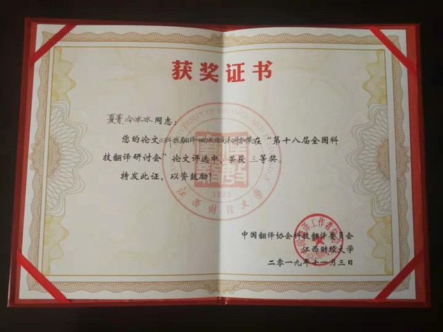 大会共设四个分论坛:分论坛一为机器翻译及其应用;分论坛二为科技和术语翻译;分论坛三为典籍翻译,分论坛四为实用文体翻译,大家就自己研究的领域进行了踊跃发言和热切讨论。beat365官网MTI导师冷冰冰副教授、邹建玲副教授及MTI研究生夏菁、张红参加了此次学术盛会。邹建玲副教授在分论坛四进行了题为“信、达、雅在翻译实践中的运用---以《简单规则》的英译汉为例”的论文宣读。冷冰冰副教授指导研究生夏菁同学和张红同学在分论坛二分别完成题为“科技翻译中的术语变体与译者对策”及“揭开术语变体山真面目---《术语变体研究的多元视角》介评”的论文宣读。在本次研讨会上,夏菁和冷冰冰副教授合作的论文“科技翻译中的术语变体与译者对策”在优秀论文评奖中荣获三等奖。