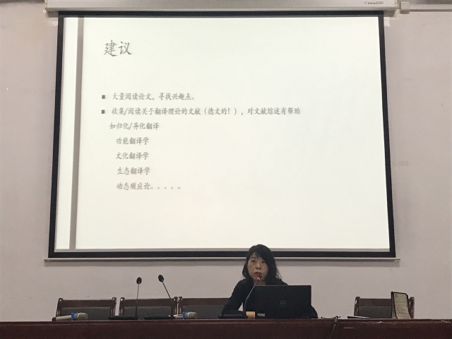 首先由叶苏老师介绍了翻译方向的论文选题。叶老师结合往届翻译类选题,分别介绍了学术型论文和翻译实践报告的特点和要求。前者是基于某一翻译理论,选定某一译作,对其中的翻译策略进行分析,而后者则是在自己的翻译实践基础上,针对所翻译文本的特点,分析翻译难点以及自己使用的翻译策略。叶老师还强调,无论是学术型论文还是实践报告,都需要有个人的创新之处。