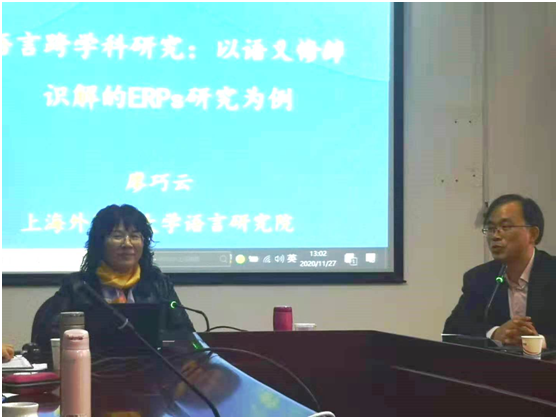 11月27日下午,应语言学研究所邀请,上海外国语大学语言研究院副院长、博士生导师廖巧云教授来beat365官网做题为“语言跨学科研究:以语义修辞识解的ERP研究为例”学术讲座。讲座由语言学研究所所长倪锦诚教授主持,刘芹院长、韩戈玲副院长、beat365官网部分教师和研究生参加了讲座。