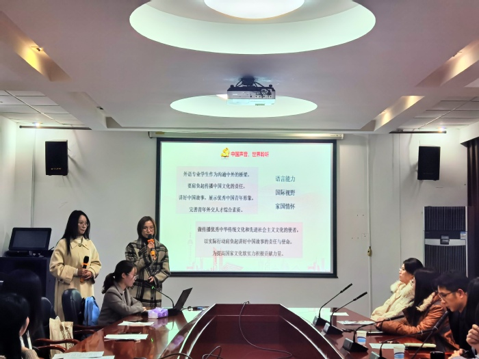 董丽媛介绍了英语语言文学研究生党支部概况,强调支部在提高党员党性修养、发挥先锋模范作用、增强党支部的凝聚力和辐射力、促进外语人才成长方面不断创新思路、突破固有模式。