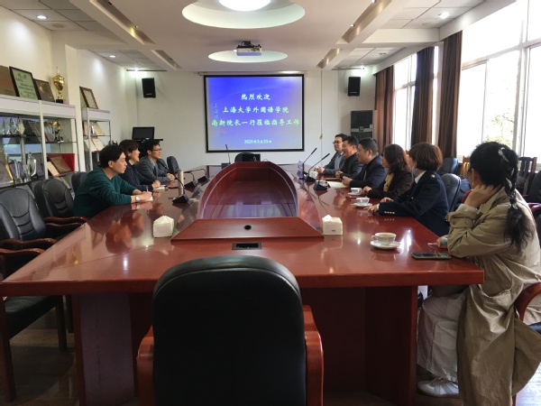 2021年3月25日,上海大学外国语学院尚新院长一行到beat365官网调研。院长刘芹、副院长陈琦、教研办公室主任郑元丰及相关人员参与交流。刘芹首先介绍了beat365官网实验室建设的整体规划、基本布局、队伍建设及特色设备,包括具有国内一流水平的同传实验室、笔译实验室和自主学习中心等。