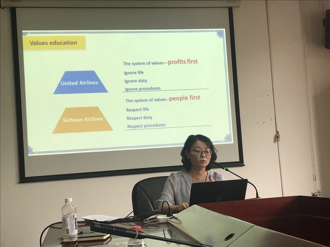 随后,作为系部课程思政“1+1+1”系列活动牵头人的黄芳老师与参会老师们分享了一则由其亲自制作并实施的课程思政案例,示范了如何将课程思政元素融入外语教学之中。黄芳老师选取商务英语中“危机公关”为讲授要点,通过对比分析四川航空和美联航迥异的危机公关策略及其成败得失,彰显了我国政府真正“以民为本”的执政理念和中国特色社会主义制度无可比拟的优势,强调大学生应在牢固树立“四个自信”的前提下为实现中华民族伟大复兴的中国梦贡献自己的力量。