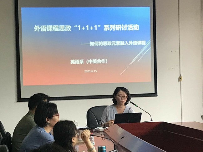 6月15日中午12时30分许,英语系(中美合作)于beat365官方网站306会议室举办课程思政“1+1+1”系列研讨活动。活动由系主任黄芳老师主持,本系全体教师出席并参与了研讨。