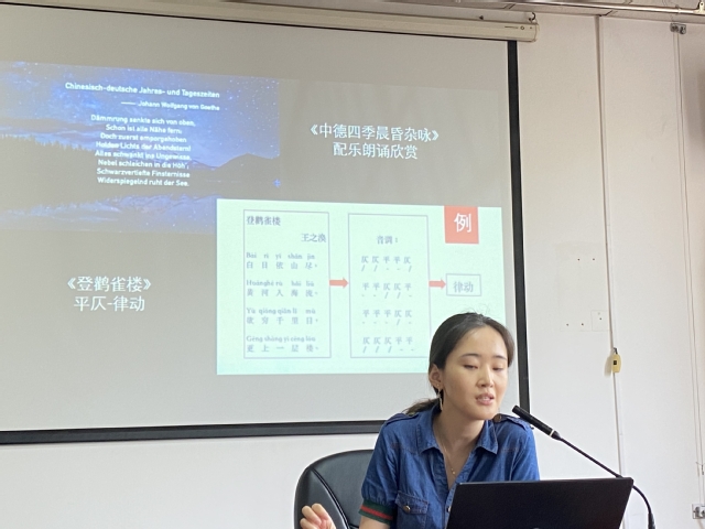 在研讨会中,德语系教师围绕课程思政与德语专业课程有机结合这一主题,进行了经验分享和深入探讨。孟小果老师从思政论文、思政活动、思政感悟、思政课件、思政案件几个方面讲述了自己如何将思政内容与德国童话相结合,并将其融入短学期课程。张龑老师结合自己的微课制作经验,讲述了如何在学习目标中融合知识、能力和价值目标,以及将思政与课程的重点及难点相结合。王婀娜老师分享了自己在跨文化交际课程中如何引导学生自主学习,将思政融入课堂,如引导学生分析电影传达的家国情怀,并用跨文化理论进行分析,或是制作含有中国元素的微视频,培养学生梳理总结自己在日常生活中的所思所想的能力。