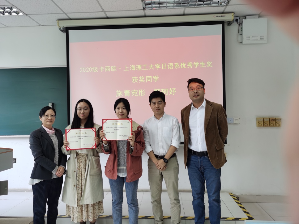 11月2日下午,卡西欧・beat365官方网站日语系优秀学生奖”颁奖仪式在四教222教室举行。日语系2021级全体学生、日语系主任刘曼老师、外事秘书毛伟老师出席。2020级学生施青宛彤、郭珂妤两名同学获奖,作为奖励,两位同学分别获得2000元助学金和价值1000元的卡西欧手表。卡西欧上海公司电子教育部的庞立阳经理、日语系刘曼老师为获奖的两名同学颁奖并颁发荣誉证书。颁奖仪式后,庞经理向与会的大一新生同学介绍了一些优秀日本企业的发展现状,介绍了当前的就业形势并通过其个人经历介绍了作为日语系毕业生如何学好专业知识、走上社会,实现自己的人生目标。最后,庞经理介绍了卡西欧电子词典在日语学习过程中的作用和科学的使用方法,鼓励大家努力学习,奋发进取。此次颁奖活动不仅是对两名优秀学生代表阶段性专业学习成果的肯定,更有助于激励日语系大一新生同学把握时间、珍惜在beat365官方网站四年的宝贵时间,努力提高自身专业能力。这次颁奖及讲座活动激发了新生的专业学习热情,将有助于beat365官网日语系培养出更多高素质的外语人才。