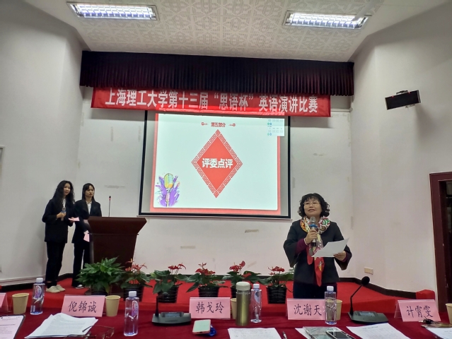 计霄雯老师以房屋建造为喻,生动的讲述了主题、论点、结构、论据等演讲要素之间的关系,并鼓励同学多把握类似机会,不断练习,提升自己。韩戈玲教授对参赛选手进行了专业点评,赞扬了选手的语言使用能力,肯定了选手结合国家大事进行演讲的时政治观,并用五个单词总结了选手们的精彩表现“confidence”“correctness”“innovation”“rich”“appreciative”。