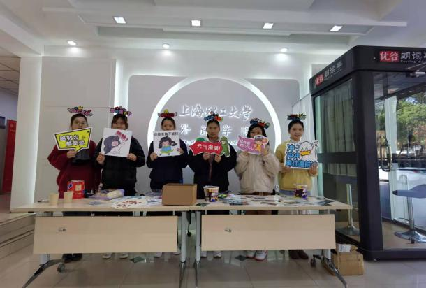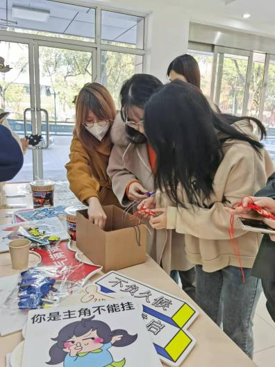 外院一楼大厅里格外热闹,空气中氤氲着可可的香味,盲盒里放满了色彩明丽的福袋,写满祝福的贺卡铺满了桌子,给人一种愉悦之感。学弟学妹们手举标牌给学姐学长们助威加油,学姐学长们纷纷上前挑选自己喜爱的贺卡,抽取属于自己的福袋,福袋上镌刻着“金榜题名”“锦鲤相伴”“学业加持”等寓意美好的字样,祝福考研学子鹏程万里。