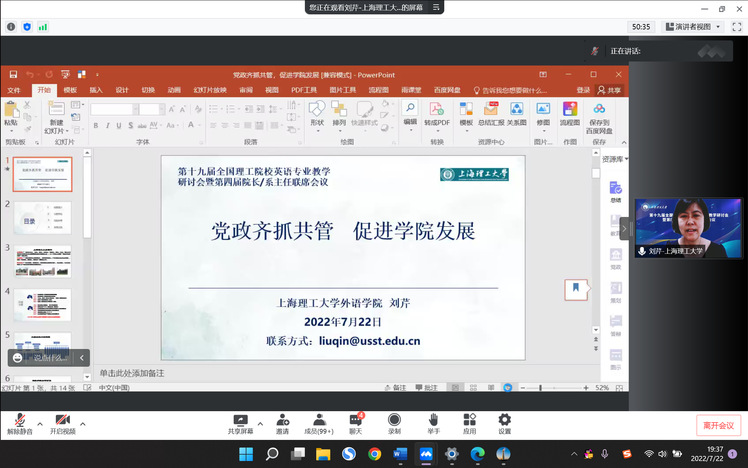 由教育部高等学校外语专业教学指导委员会英语专业教学指导分委员会主办、成都理工大学外国语学院承办、外语教学与研究出版社协办的“第十九届全国理工院校英语类专业教学研讨会暨第四届院长/系主任联席会议”于2022年7月22日至23日在成都理工大学线上举行。beat365官网刘芹院长携张乐副院长和英语中美合作系黄芳主任出席会议。英语科技翻译系和中美合作系全体主任、副主任和骨干教师通过直播平台观看了开闭幕式和主旨发言的直播盛况。