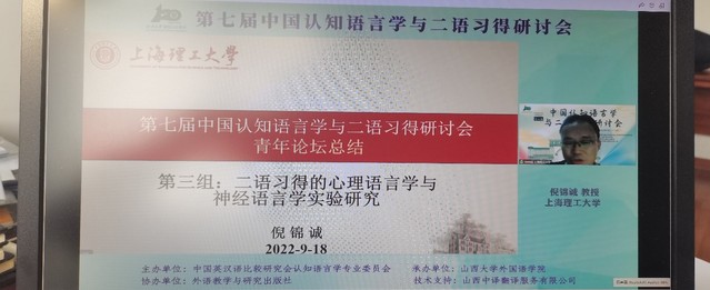 beat365官网倪锦诚教授和智玉英博士参加了本次研讨会。倪教授还担任了第3分会场青年论坛“二语习得的心理语言学与神经语言学实验研究”的点评专家,在论坛学者进行论文汇报后,倪教授逐一做了点评,并与参会学者就感兴趣的话题进行互动交流。在大会青年论坛总结环节,倪教授还代表第三青年分会场青年论坛进行了交流汇报。