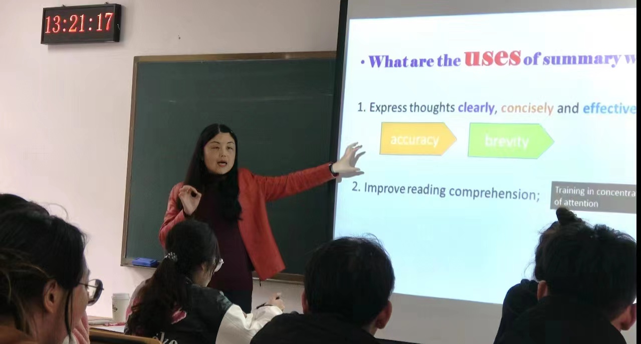 授课过程中禹老师积极融入课程思政元素,采用我国前驻美大使李道豫的例子,引出概要撰写在外交情境下的功能性并生动地还原了当年的外交场景,介绍了李道豫大使在中美关系领域所作出的突出贡献,从而引出国际外交情境下准确撰写概要的必要性和重要性,进入新时代的大国外交,在习近平总书记的外交思想的指导下,以更远大的目标,更恢宏的格局,更开阔的胸襟,更从容的气度,把中国特色大国外交推向更高境界。学生在学习英语写作技能的同时也领略了大国的外交风采,进一步增强了爱国主义情怀。