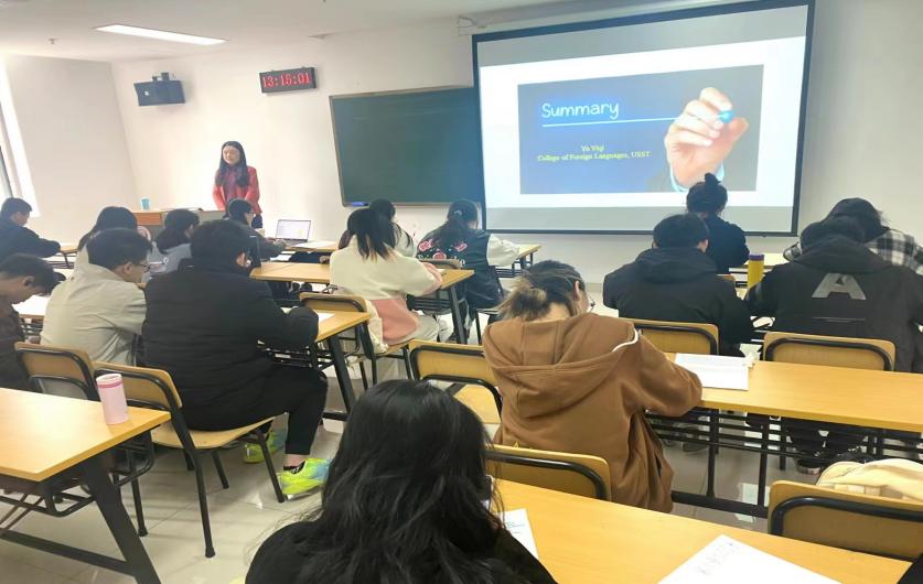 2023329日,英语系(中美合作)在国合楼202教室举行大思政课”建设推进任务公开课观摩活动,本次公开课为由禹一奇老师主讲《英语写作4》,英语(中美合作)系部分教师参与了课堂观摩并在课后开展研讨活动。