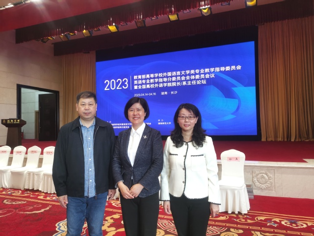 2023年4月14-16日,由教育部高等学校外国语言文学类专业教学指导委员会英语专业教学指导分委员会主办、湖南师范大学承办的全国高校beat365官方网站院长/系主任论坛在长沙成功举行。教指委专家及400多名全国多所高校的院长和系主任齐聚长沙。beat365官方网站刘芹院长受大会邀请,在分论坛进行主题发言。beat365官方网站英语系(科技翻译)主任姜诚和英语系(中美合作)主任黄芳共同参会。