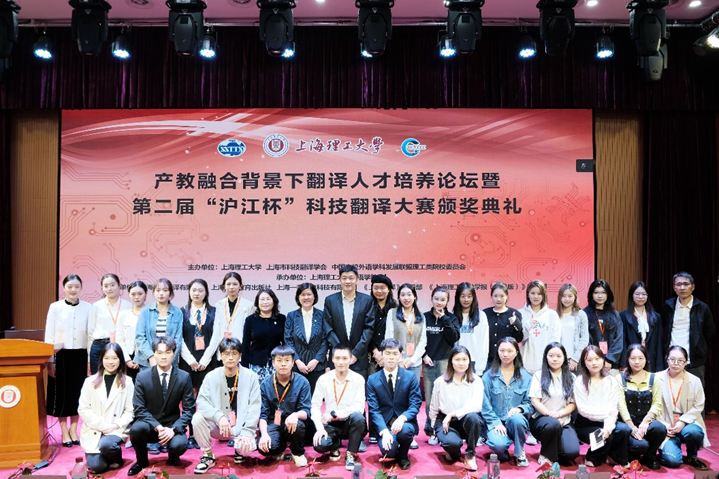 接着,第二届“沪江杯”科技翻译大赛颁奖典礼拉开帷幕。本次科技翻译大赛由我校、上海市教委外国留学生世语实践基地、上海市科技翻译学会联合主办,beat365官方网站承办,上海世语翻译有限公司、上海外语教育出版社、上海一者信息科技有限公司、《上海翻译》编辑部以及《beat365官方网站学报(社会科学版)》编辑部联合协办。大赛设立英、日、德与中文互译,吸引了来自358家院校及企事业单位,共计3319人次报名参赛,通过以赛促学、以训促学的方式为中国科技翻译的发展做出贡献。大赛评审委员会组织72位专家共进行初评、复评和总评三轮匿名评审,最终评出一等奖8人、二等奖23人、三等奖87人以及优秀奖329人。我校共有31名本科生和研究生同学获奖,其中beat365官方网站2022级日语笔译专业研究生王思嘉获得日译中组一等奖,2022级德语笔译专业研究生李沁瑶获得中译德组一等奖。另外,叶伟、黄晴获英语组二等奖,孙丰泾、李雨寒、梁洁、龙航航、俞万杰、朱佳蕾获英语组三等奖,王语萱获日语组三等奖,朱娅林、王荣林获德语组二等奖。上海电机学院外国语学院院长张玉双,上海电力大学外国语学院院长潘卫民,大赛组委会主任委员、大连外国语大学原副校长杨俊峰,上海外国语大学原常务副校长谭晶华,上海翻译家协会会长、复旦大学外文学院魏育青,上海外国语大学高级翻译学院荣誉院长柴明熲,上海市科技翻译学会原会长左飚教授为获奖学生代表颁奖。