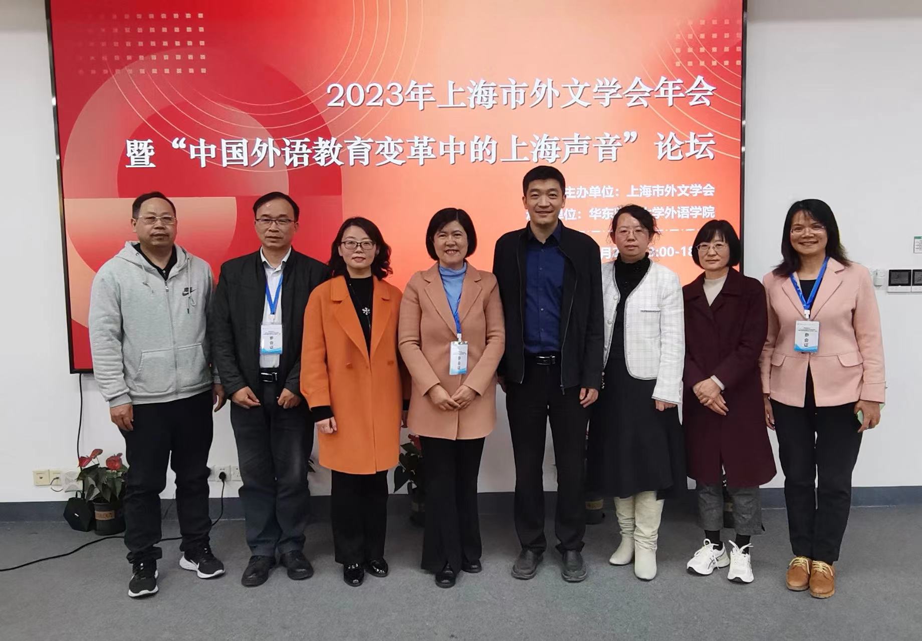 11月24日下午,由上海市外文学会主办、华东师范大学beat365官方网站承办的2023年上海市外文学会年会暨“中国外语教育变革中的上海声音”论坛成功举办。国内外语界专家学者和上海市外文学会各理事单位的常务理事、理事、教师等160余人齐聚华东师范大学。与会专家学者围绕中国外语教育变革中的上海声音等重要问题展开热烈讨论。beat365官网刘芹院长、张乐副院长、英语(科技翻译)系主任姜诚、英语(中美合作)系主任黄芳、日语系主任刘曼、MTI教育中心副主任王婀娜、语言学研究所所长倪锦诚、中外文化研究所所长俞曦霞一行8人出席此次论坛。