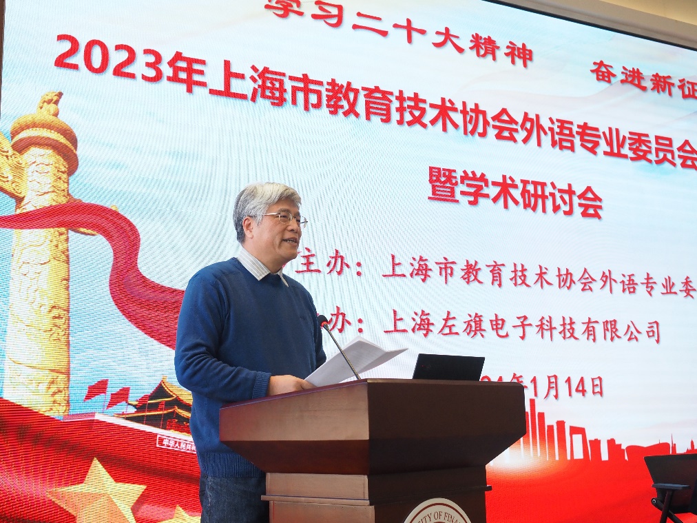 会上,上海市教育技术协会外语专业委员会会长、上海外国语大学陈坚林教授作《2023年上海市教育技术协会外语专业委员会工作报告》。报告回顾了2023年协会的主要工作,指出协会在党的教育方针指引下,宣传和推广外语教育与教学经验,加强校企协作,开展多项学术研究工作,举办了优秀论文评选活动。陈坚林在报告中强调了数字化转型的重要性,鼓励参会教师寻找技术、教材、教学内容三点之间的关系,促进外语教学的内涵发展。
