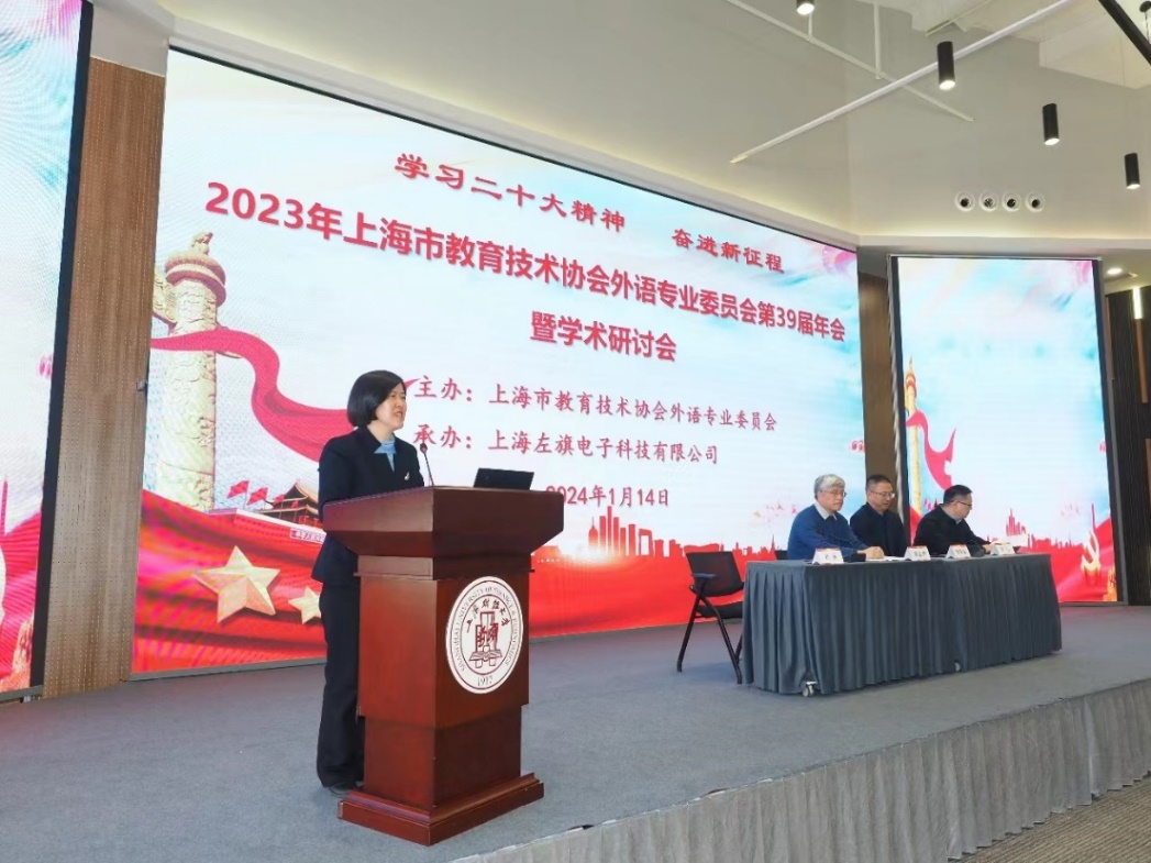 2024年1月14日,上海市教育技术协会外语专业委员会第39届年会暨学术研讨会在上海财经大学科创园区圆满召开。来自复旦大学、上海交通大学、上海外国语大学、同济大学、华东师范大学、上海财经大学、beat365官方网站等30多所院校的领导、专家学者、教师代表以及外语教育技术厂商代表60余人参会。beat365官网院长刘芹教授携优秀论文评选获奖教师应邀参加会议。大会开幕式由刘芹主持。