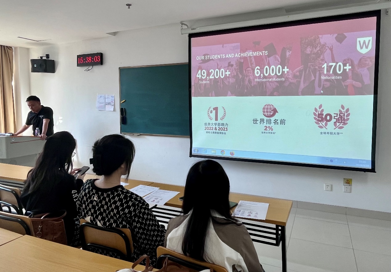 在宣讲活动中,张老师首先介绍了西悉尼大学的卓越发展历程和多元化教学特色,特别强调了该校在翻译类和教育类课程方面的全球声望。随后,他详细解读了西悉尼大学与我校签署的本硕连读和硕士联合培养项目的课程设置、奖学金机制以及申请流程,同时介绍了在澳大利亚生活等方面的相关信息。张老师表示,西悉尼大学一直致力于为学生提供国际化的学习平台,希望此次宣讲活动能够为更多同学拓展国际视野,获得丰富的学术体验。