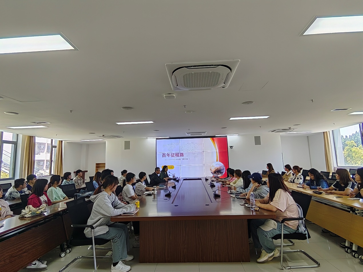 朱老师将党的百年奋斗史分为“星火燎原”、“建设新中国”、“改革开放”、“百年复兴”四个篇章,带领同学们回顾了党的伟大征程。