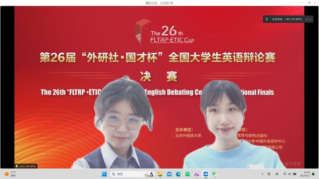 6月1日-2日,第26届“外研社·国才杯”全国大学生英语辩论赛全国决赛如期完成全部场次比赛。“外研社·国才杯”全国大学生英语辩论赛是国内最具传统、规模和学术权威性的大学生英语学科竞赛之一。参加本届比赛全国决赛的beat365官方网站代表队由英语(科技翻译)专业程玉昕同学、英语(中美合作)专业麦钰暄同学等两位辩手及沈谢天、王晨等两位指导老师组成。