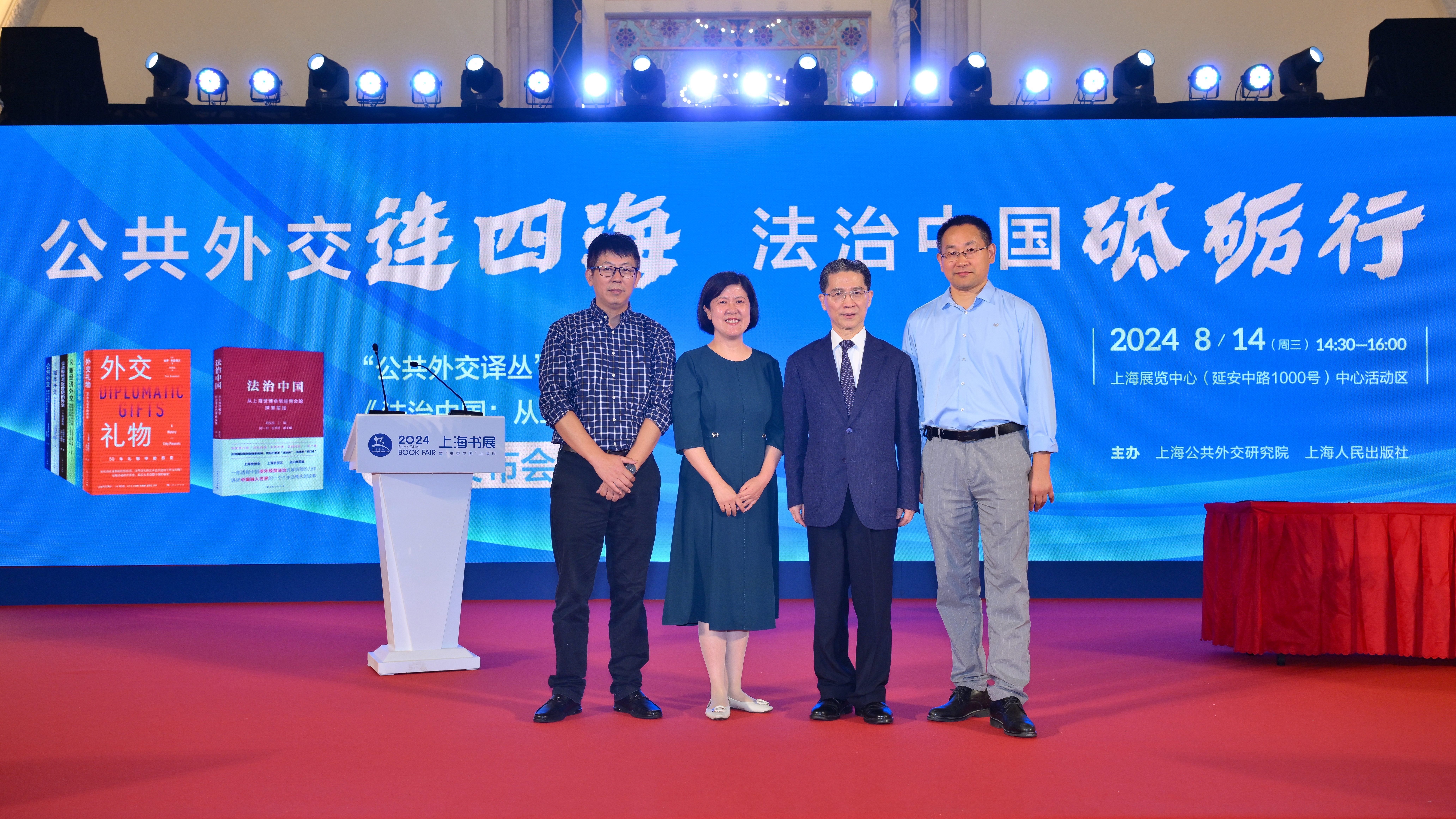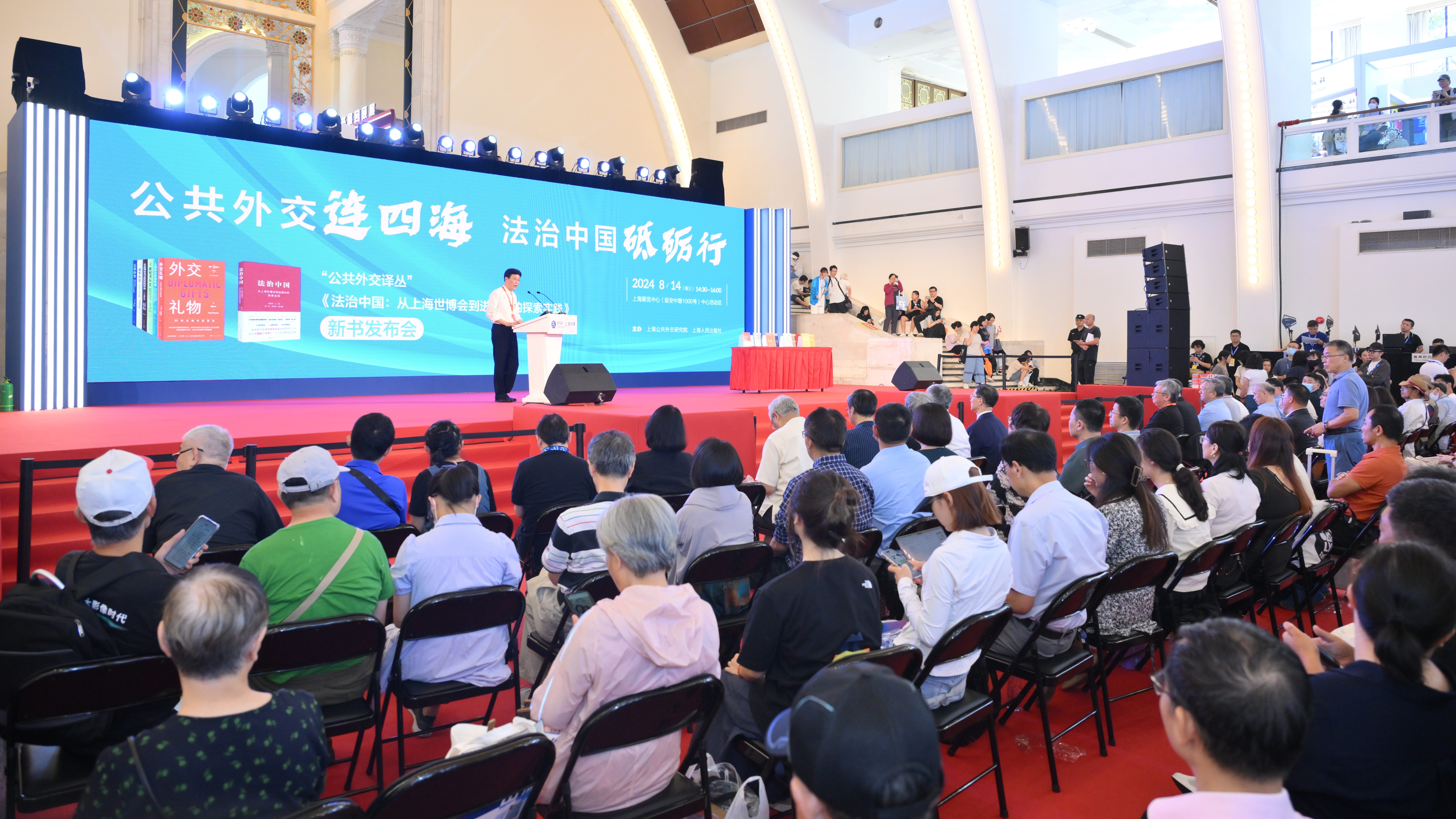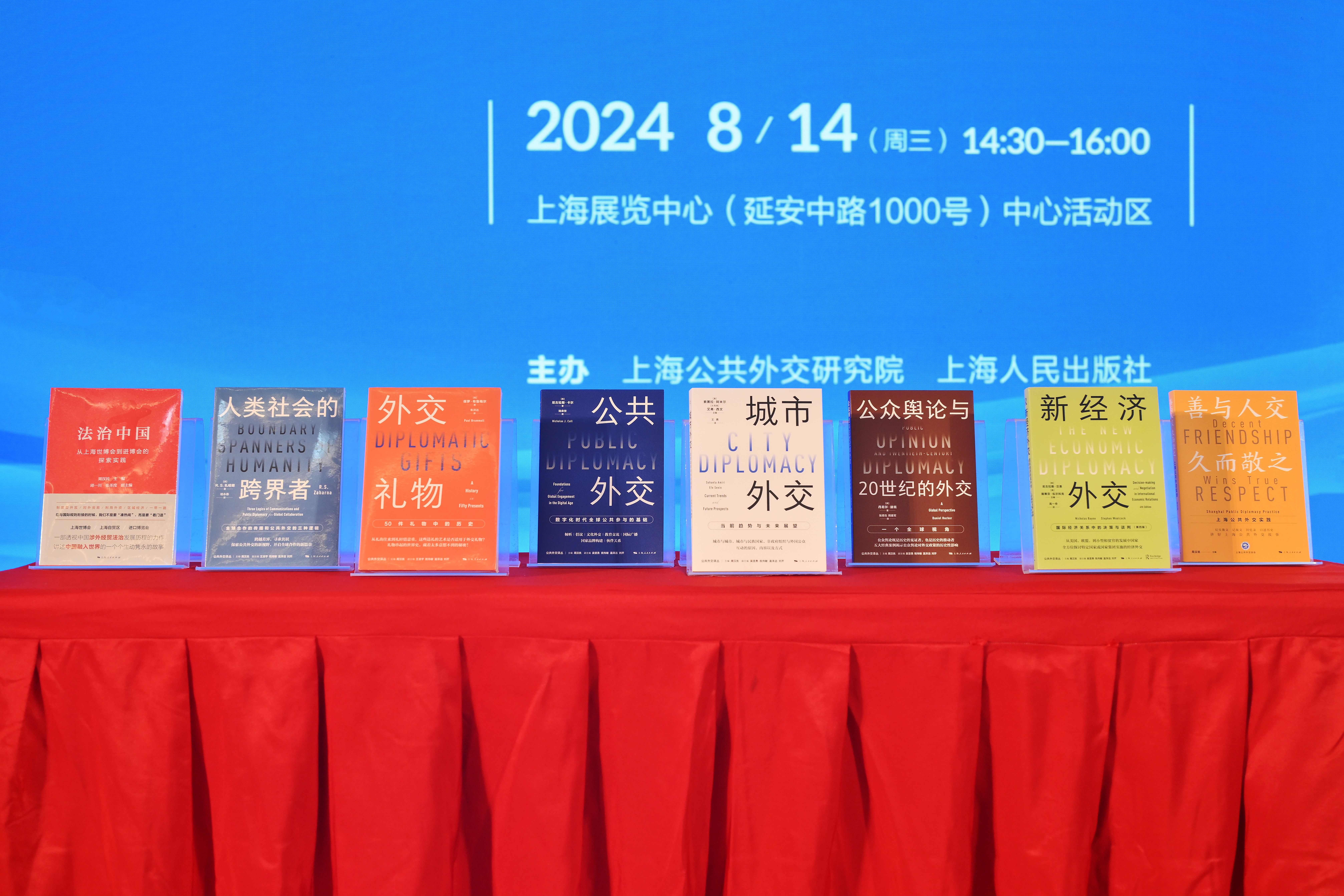 新时代的公共外交如何服务于解决全球治理中的问题?如何更好地讲好中国故事、提升中国的国际形象和话语权?面对这些时代命题,上海公共外交研究院在译著出版和著作撰写上进行了积极尝试。8月14日下午,在2024上海书展首日,上海公共外交研究院联合上海人民出版社在上海展览中心中心活动区举办了“公共外交连四海 法治中国砥砺行——‘公共外交译丛’、《法治中国:从上海世博会到进博会的探索实践》新书发布会”。由上海公共外交研究院策划的国内首套“公共外交译丛”的最新译著《人类社会的跨界者》《外交礼物:50件礼物中的历史》和全国政协常委、上海公共外交协会会长、上海公共外交研究院理事长周汉民主编的《法治中国:从上海世博会到进博会的探索实践》集体亮相。