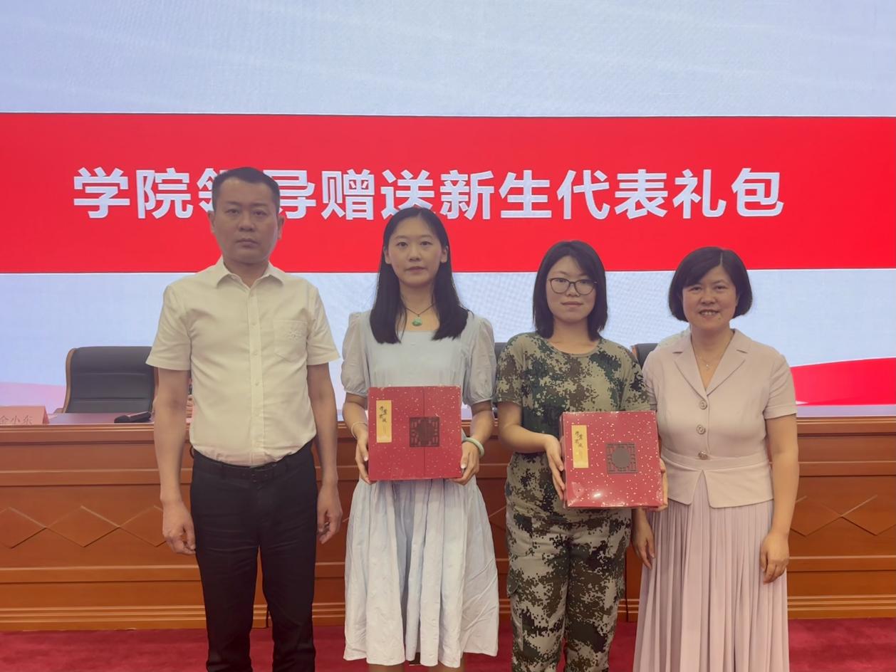 学院党委书记曲德强、院长刘芹赠送新生代表礼包