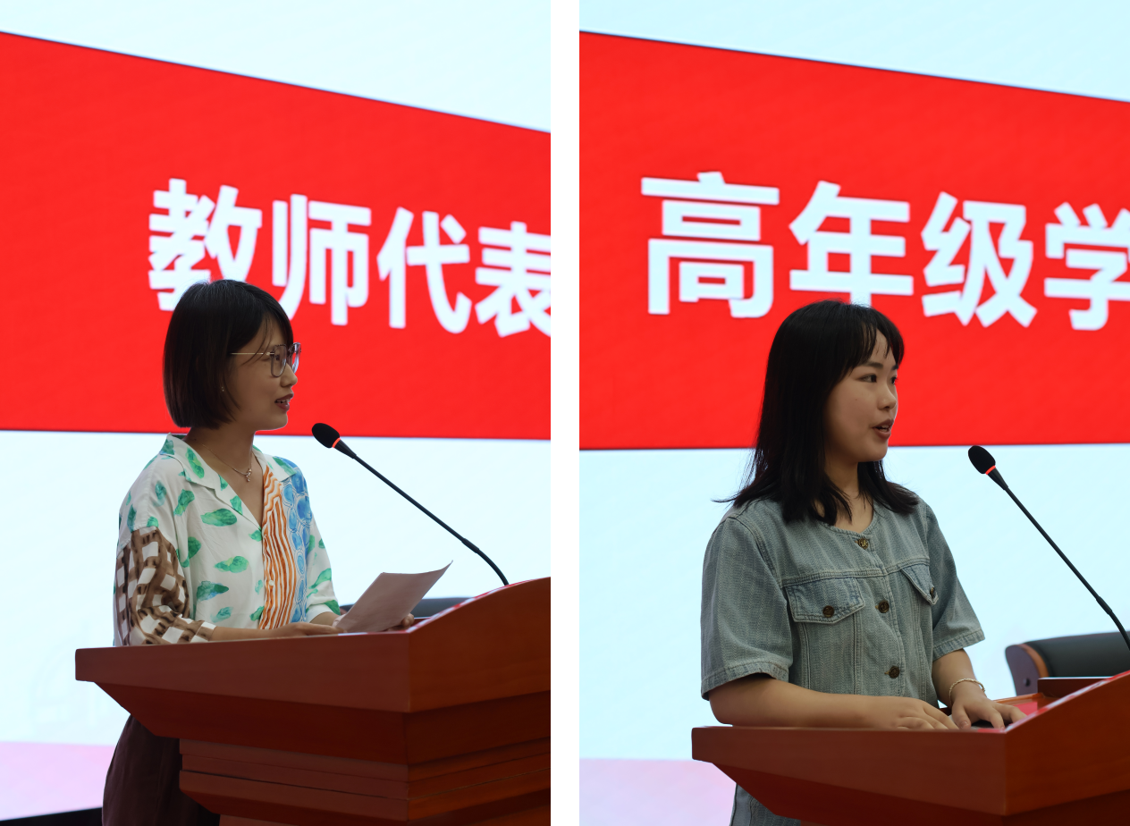 教师代表王晨老师(左)、老生代表孙文娟(右)发言