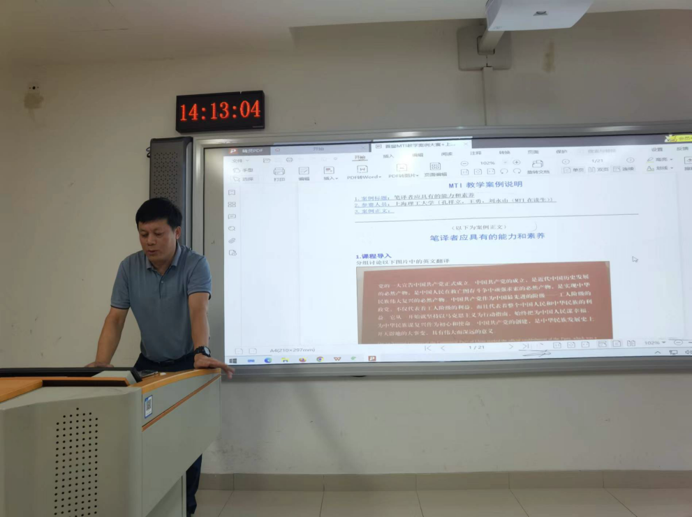 在课程思政教学研究交流环节,贾晓庆、智玉英和孔祥立三位老师相继分享了他们获奖的课程思政案例。贾老师通过深入挖掘教学内容中的思政元素,将其巧妙融入中高级口译课程教学中,同时她也强调了科技元素在科技口译课程的灵活运用。智老师分享了英语视听课程中的思政案例,阐述了她在课堂上如何环环相扣,鼓励学生发表观点、相互提问,激发学生对社会问题的关注与思考,在潜移默化中培养学生的思辨性思维和创新能力。最后,孔老师分享了他将毛泽东的学习经历以及教师自身对翻译实践一丝不苟的严谨求知精神放入案例中,让学生以前人为榜样,将思政教育贯穿于教学全过程中。
