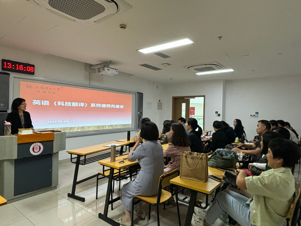 为迎接第40个教师节,贯彻落实《中国中央国务院关于弘扬教育家精神加强新时代高素质专业化教师队伍建设的意见》精神,根据学校及学院师德师风建设月活动安排,英语(科技翻译)系于9月24日下午,在国合楼210教室开展了“以大力弘扬教育家精神,加快建设教育强国”为主题的师德师风专题教研活动。