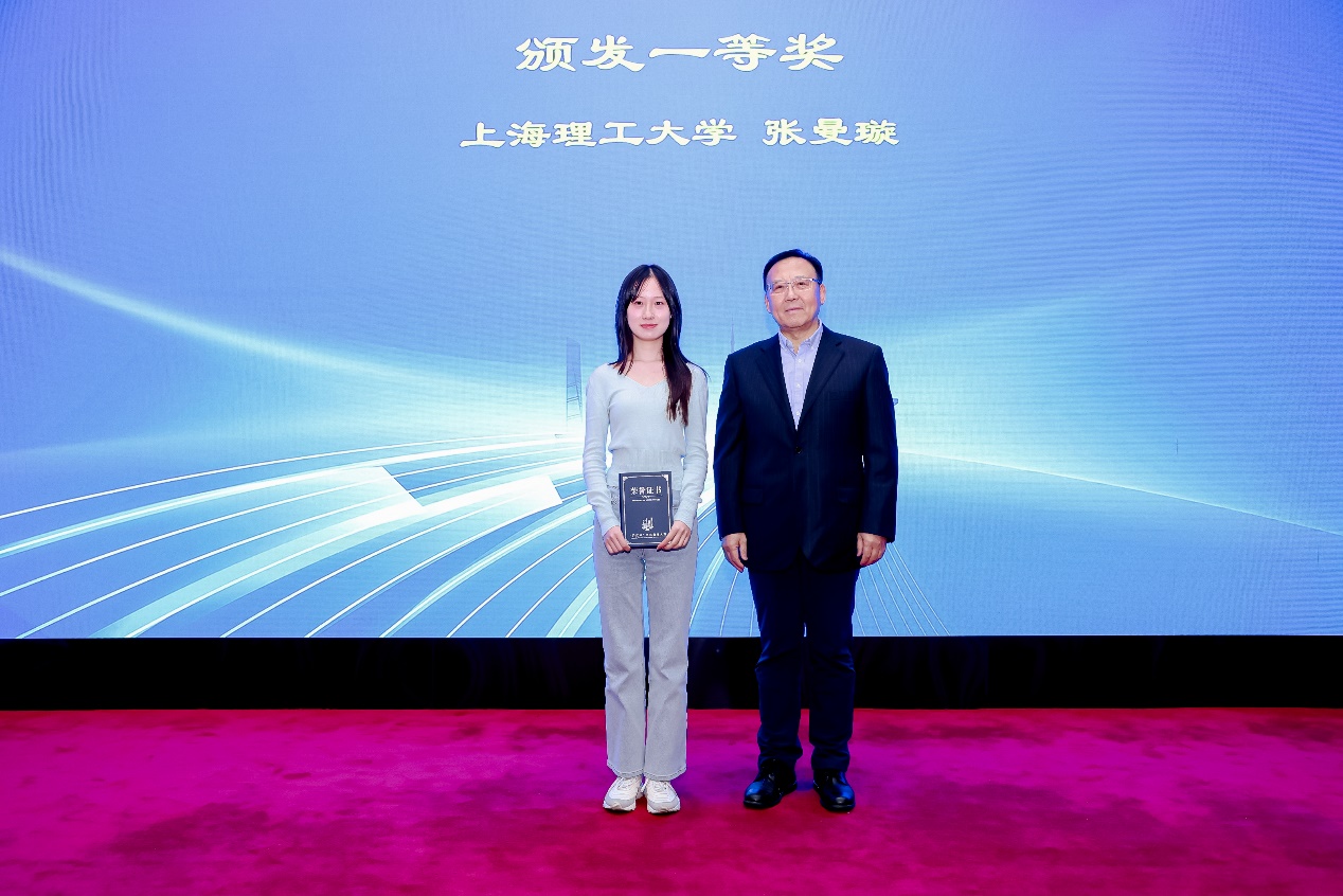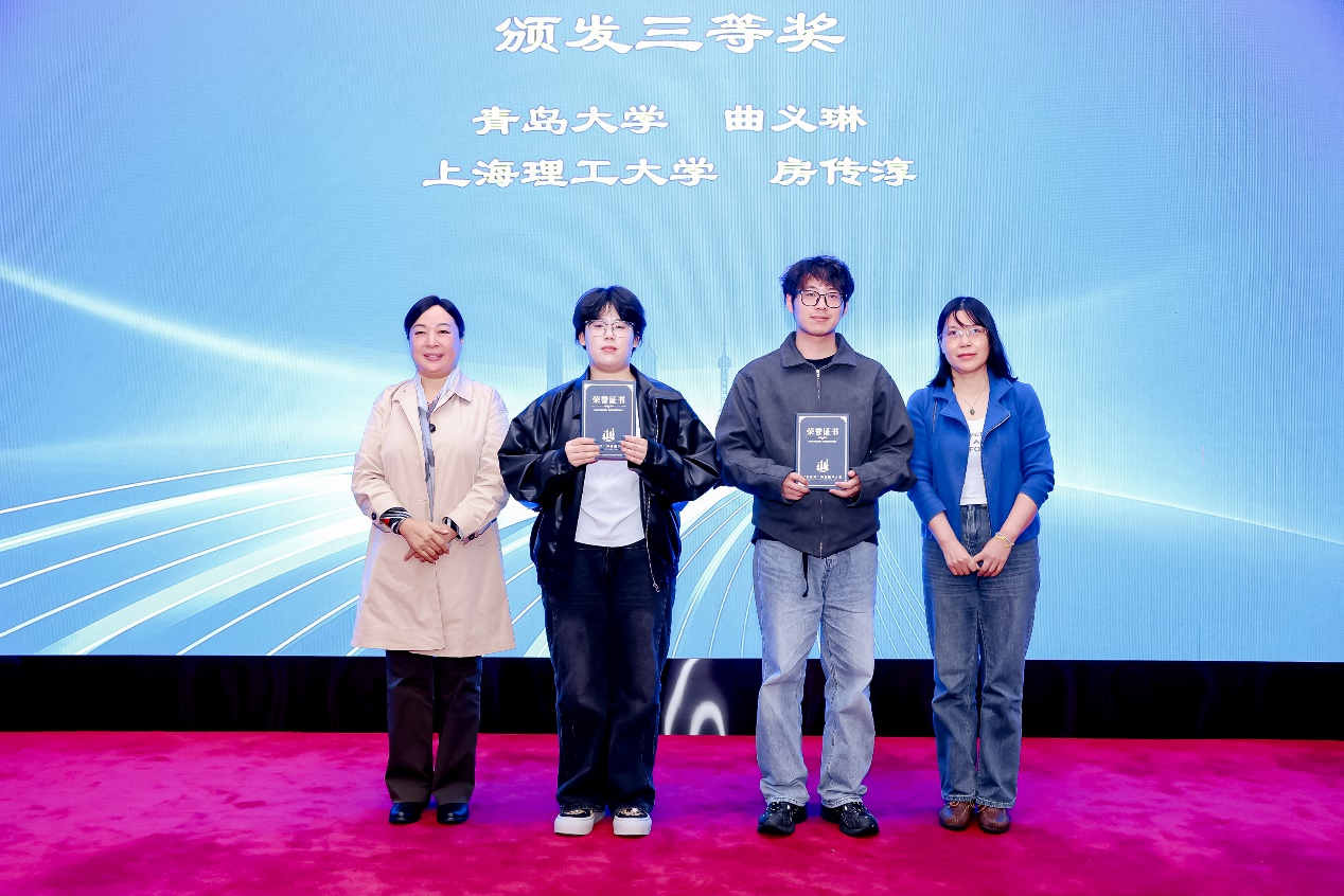 接着,第三届“沪江杯”科技翻译大赛颁奖典礼拉开帷幕。本次大赛设立英、日、德与中文互译,吸引了来自285家院校及企事业单位、共计2261人次报名参赛。大赛评审委员会组织34位专家共进行初评、复评和总评三轮匿名评审,共评选出379名获奖者。其中,英语组获奖人数为250人,日语组获奖人数为71人,德语组获奖人数为58人;一等奖10人,二等奖20人,三等奖65人和优秀奖284人。大赛组委会主任委员、大连外国语大学原副校长杨俊峰,东华大学beat365官方网站院长张曦教授,上海体育大学新闻与传播学院院长陈丽江教授,上海电机学院外国语学院院长张玉双教授,上海建桥学院外国语学院副院长王海燕教授为获奖学生代表颁奖。一等奖获得者、我校23级翻译专业研究生张曼璇发表获奖感言。