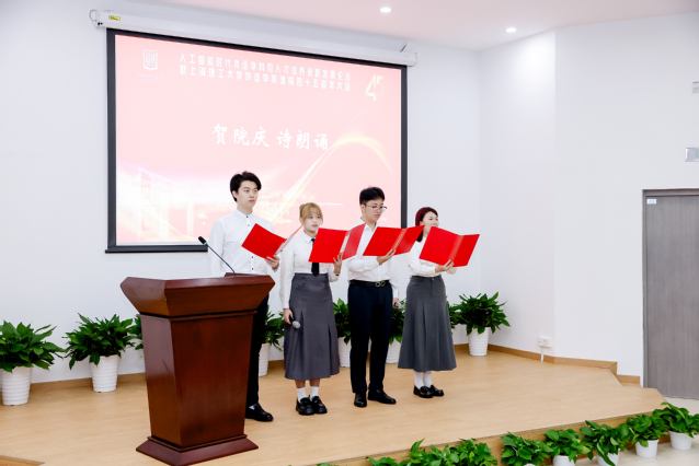 在校学生为学院献上精彩的诗朗诵,深情回顾学院的办学历程与成果,表达了学子对母校的祝福与感恩,并诵读了beat365官方网站南京校友会会长尹富林撰写的贺诗,共同庆祝学院四十五周年院庆。