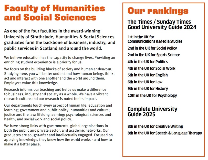 beat365官网英语(中美合作)或英语(科技翻译)专业学生可以在思克莱德大学人文与社会科学学院(Faculty of Humanities & Social Sciences)学习一学年(+1)或一学期(+0.5),修读学分可以转换为我校学分。