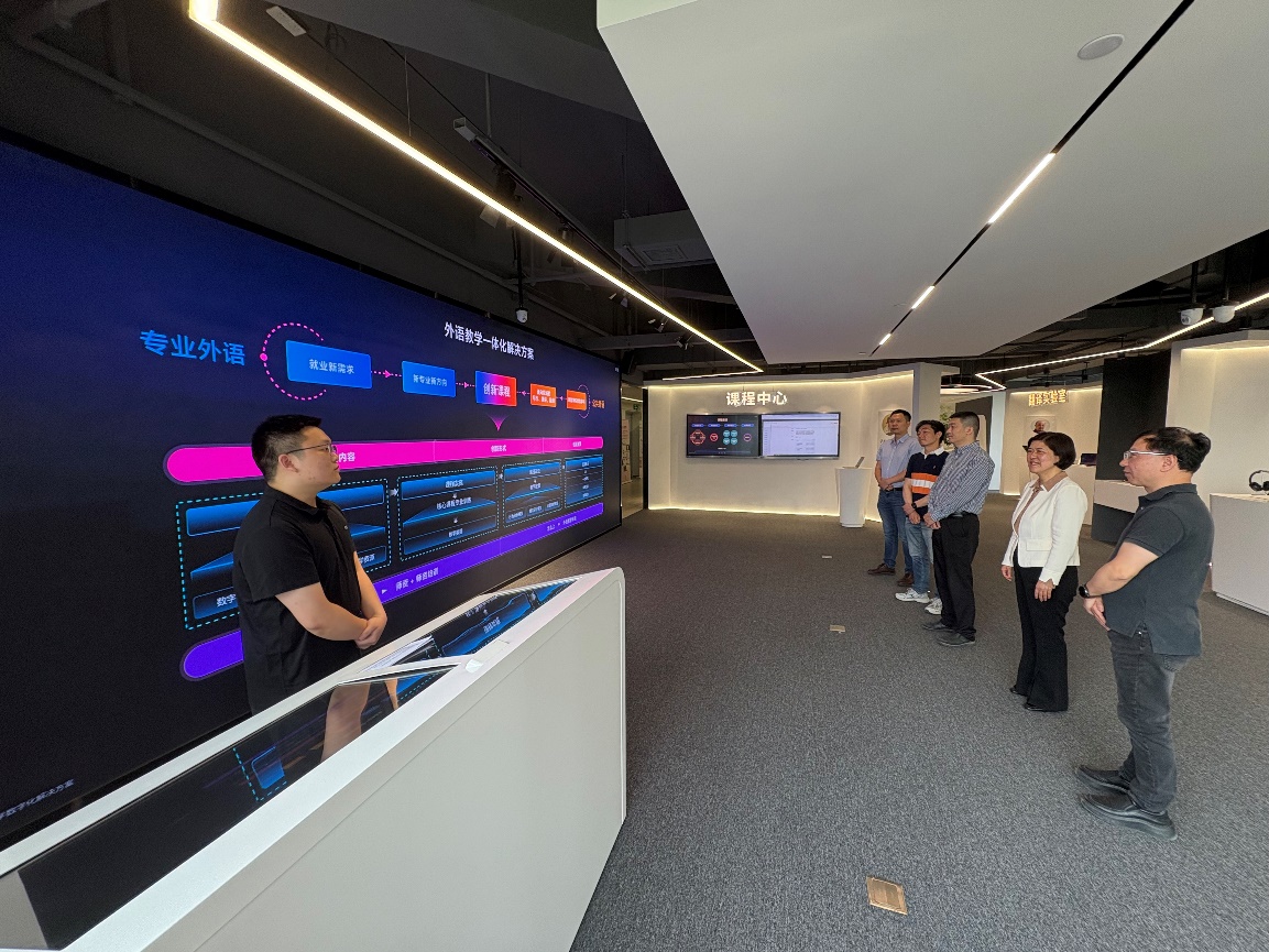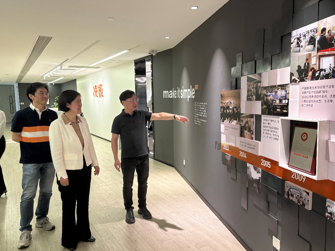 会前,刘芹一行在吴昕的陪同下,参观了上海凌极信息技术有限公司历史文化墙、课程中心、智慧语言实验室等特色体验区,深入了解了行业的前沿发展情况。