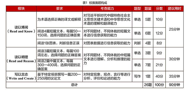 赛题以“理解中国,沟通世界”为主题,引导选手深入领会习近平新时代中国特色社会主义思想的核心要义,理解中国之路、中国之治、中国之理,涵养家国情怀、全球视野,拓展知识广度、思想深度,展现外语能力、跨文化能力、思辨能力、创新能力等综合素养。全国统一线上初赛赛题由大赛组委会提供,包括客观题若干道和议论文写作1篇,赛题构成见表1。