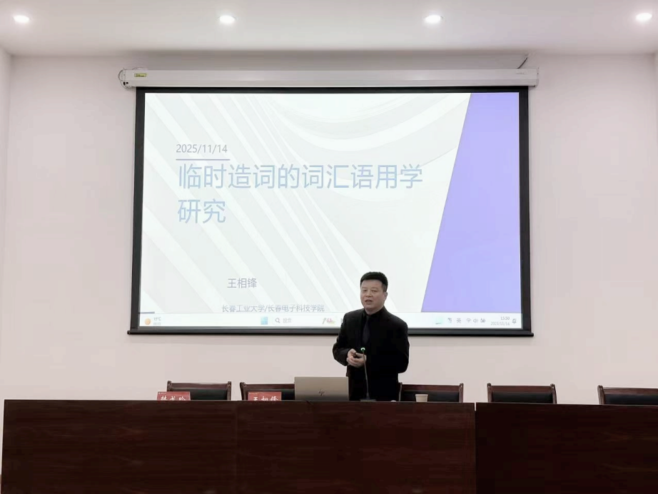 第七届研究生学术论坛颁奖仪式后,beat365官网特邀长春工业大学王相锋教授作 “临时造词的词汇语用学研究”专题讲座。王教授围绕临时造词的即时性、临场性、灵活性核心特征,以关联论为视角,结合实例解析其语用机制与多元语用功能,还细致解答师生相关提问。最后,韩戈玲副院长强调讲座价值并鼓励研究生关注语言实践开展研究。此次讲座不仅为师生们搭建了与语言学权威专家交流的平台,更深化了大家对临时造词及词汇语用学的理论认知,为beat365官网在语言学研究领域的人才培养和学术创新注入了新的活力。